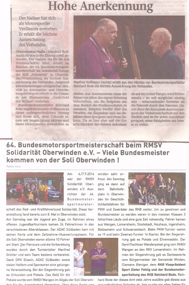 Oberwinden/Naila: Im Rahmen der 64. Bundesmotorsportmeisterschaft im Automobil-Turnier der RKB „Solidarität“ e.V. in Oberwinden/Württemberg wurde dem für die Soli Neuhaus/Selbitz fahrenden Nailaer Manfred Hoffmann eine hohe Ehrung zuteil. Aufgrund jahrzehnterlanger erfolgreicher Aktivität im Automobilsport wurde ihm höchste Auszeichnung des Verbands „Urkunde mit Ehrenzeichen Groß-Gold mit Brillant“ verliehen. Knapp 40 Jahre im Autoturnier –und Orientierungsfahrtsport benötigte Manfred Hoffmann, um die erforderliche Punktzahl von 1250 Punkten zu erreichen. Bundesmotorsportleiter Reinhard Bode beglückwünschte Hoffmann zu dieser außergewöhnlichen Ehrung und freute sich diese Urkunde einen langjährlich aktiven und fairen Motorsportler überreichen zu dürfen. Bei Autoturnieren wird vor allem Beherrschung des eigenen Fahrzeugs benötigt um die stilisierten Aufgaben aus dem Straßenverkehr zu meistern. Beispiele hierfür sind das Wenden, das Einparken oder das Befahren einer Spurgasse und eines Slaloms. Da es hier eher auf die Geschicklichkeit des Fahrers ankommt, wird die möglichst niedrige Fehleranzahl höher bewertet als die Fahrzeit durch den Parcours. Damit dient der lizenzfreie Autoturniersport im höchsten Maße der Verkehrssicherheit und ist für jeden Autofahrer geeignet, seine Fähigkeiten zu testen.